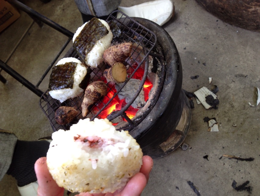 らっきょうの漬物をかじりながら、里芋も焼きます。